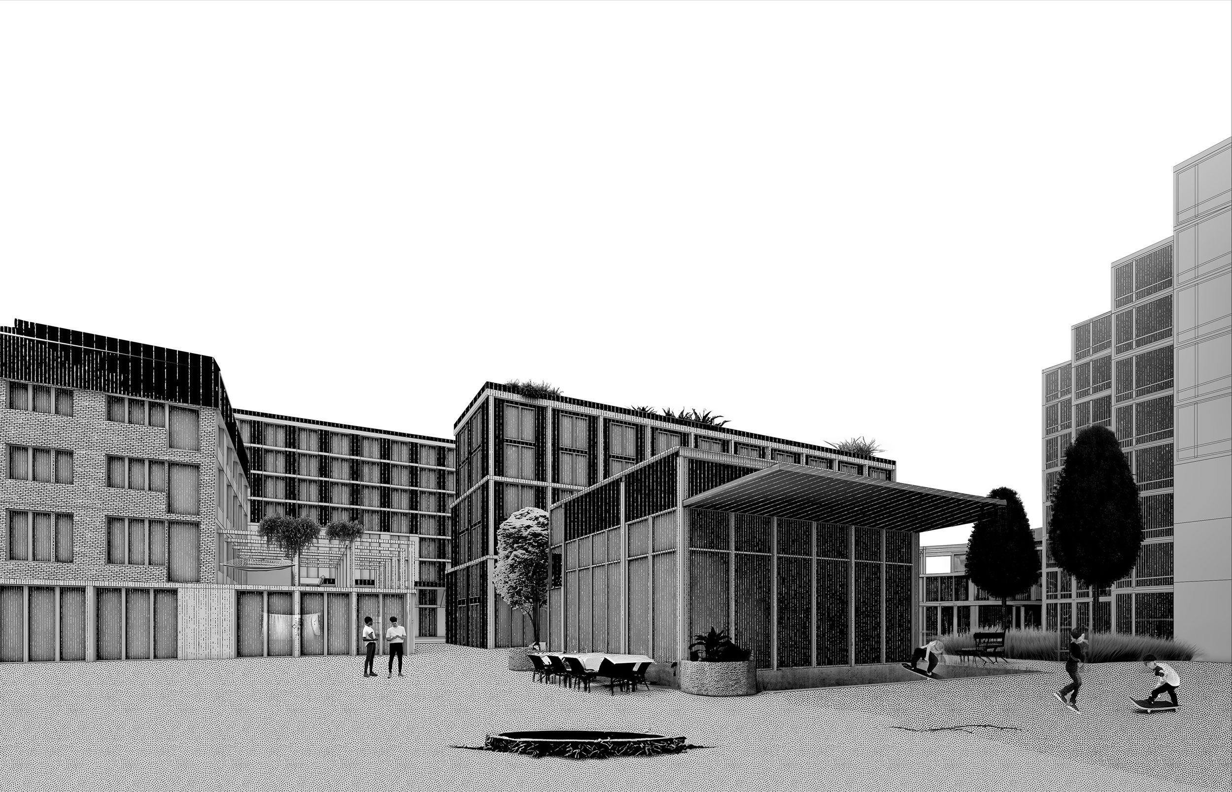 Wie sieht die Zukunft der Fabrik und ihr Image im städtischen Umfeld aus? Im Stadtteil Sévelin in Lausanne, der heute weitgehend vom Dienstleistungssektor geprägt ist, fügt sich das Projekt in die letzte Gebäudegruppe aus den 1930er Jahren ein, die an das Recyclingunternehmen Goutte erinnert. Das Programm umfasst hauptsächlich ein Zentrum für die Wiederverwendung von Bauteilen aus dem Rückbau von Gebäuden in Lausanne, was seine Lage im Stadtzentrum rechtfertigt. Hinzu kommen Wohn- und Arbeitsräume für Handwerker, die Teil einer neuen Form der urbanen, lokalen und zirkulären Industrie sind. Die architektonische Maßnahme besteht in der Installation einer Überdachung, die das bestehende Gebäude schützt. Ihre modulare Struktur erstreckt sich punktuell um die Hallen herum, was einen schrittweisen Bau ermöglicht. Dieses Gitter, das wie ein großes Regal wirkt, gewährleistet den reibungslosen Ablauf des Programms und steht gleichzeitig im Dialog mit dem umgebenden Kulturerbe. Könnten Wiederverwendung und Industrie so das Stadtzentrum wiederbeleben?