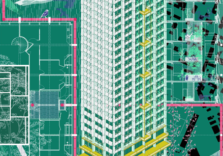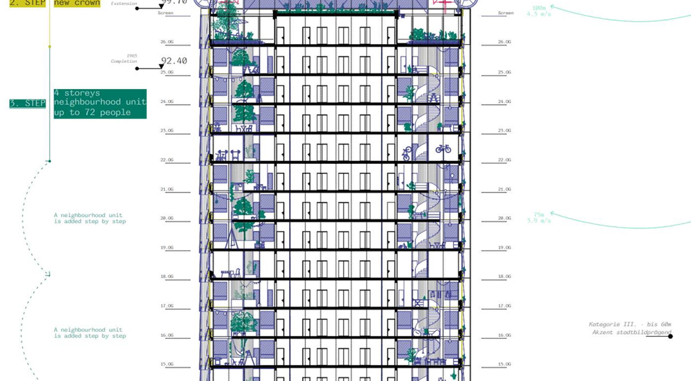High-rise buildings symbolise modernity, represent economic prowess and technological accomplishments, but must adapt to evolving social and ecological imperatives. The Sulzer high-rise, constructed as an office tower, portrayed an emblem of industrial affluence. Today, it epitomises the challenge of reimagining such monofunctional edifices for the future. The foundation for this project lies in its façade framework: it reemerges as an architectural device—the tower does not evolve from the bottom up, rather from top to bottom, mimicking a plant whose roots gradually burrow down. A steel skeleton structure reconfigures the office interiors into residential units. The transformation is also defined by principles of the circular economy: rainwater and grey water are reutilised on-site. Could this principle serve as a prototype for confronting the limitations of monofunctional office towers? Could it give rise to a system that redefines existing urban fabrics, and inspires other cities as a didactic scaffold for the future?