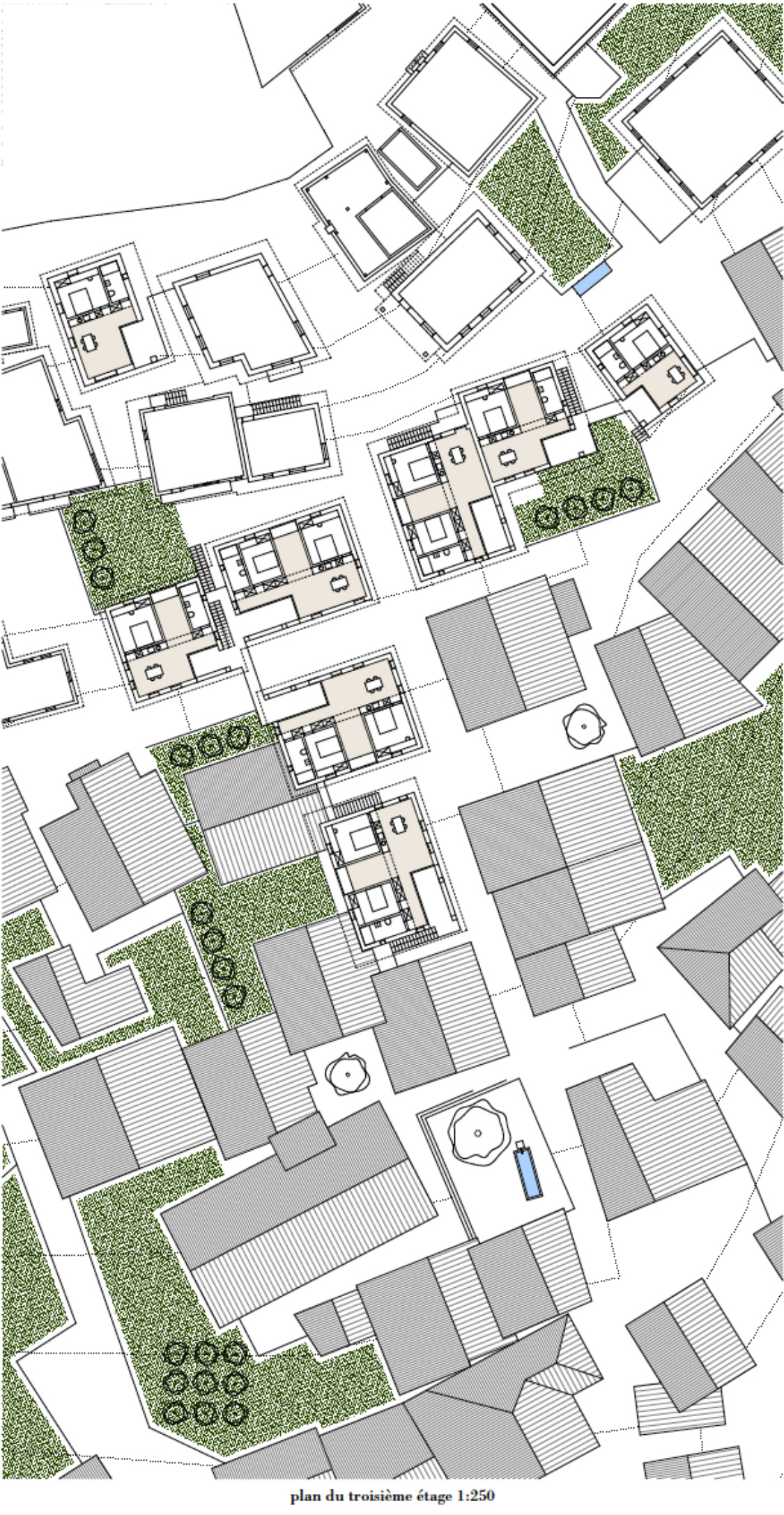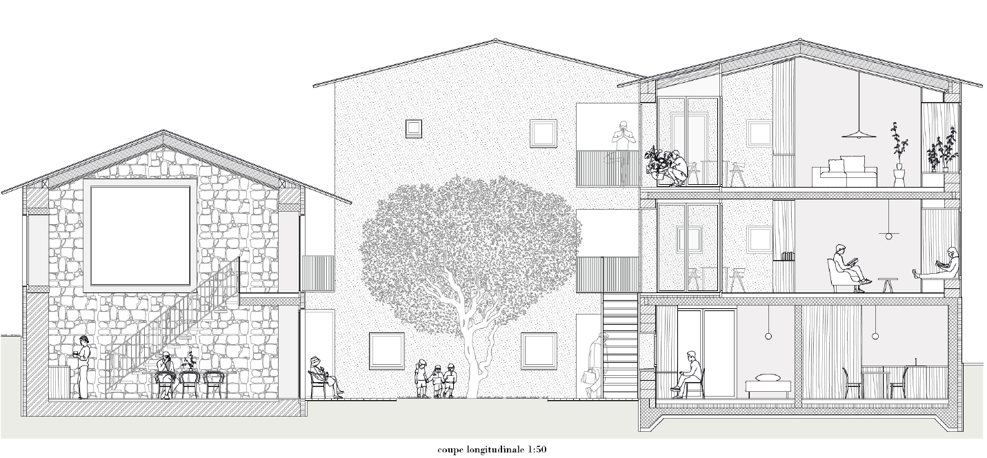 Pour intervenir dans la substance bâtie patrimoniale villageoise, le projet s’intéresse tout d’abord à l’existant et à ses qualités. Il réinterprète, avec modestie, le vernaculaire du lieu. Il intègre et réhabilite les granges existantes délaissées. Il s’inspire des espaces urbains existants, et crée ainsi un nouveau réseau d’espaces de rencontre : une petite place de la fontaine, la rue principale du village spatialement redéfinie, les seuils entre logements et espaces communs lieux de rencontre, les potagers partagés et les vergers tampons entre le noyau villageois et le développement des zones villas.