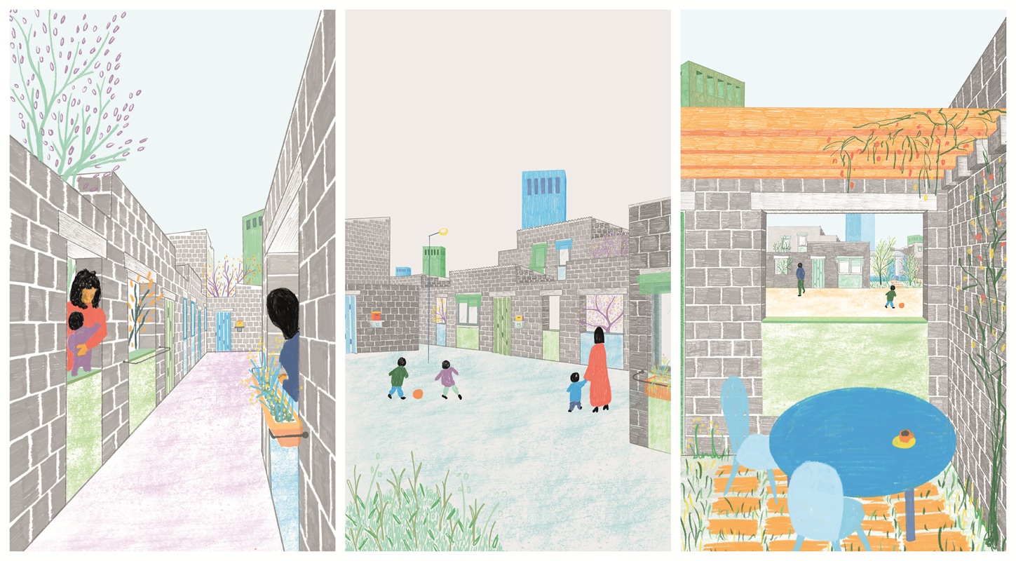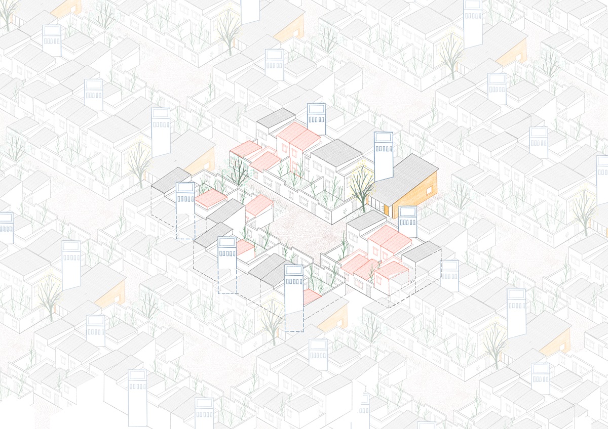 Das Projekt ermöglicht eine etappenweise Umsiedlung auf ein benachbartes Grundstück mit dem Ziel, bestehende Nachbarschaften und Bindungen zu bewahren. Daraus entsteht ein dichtes Ǫuartier mit einem kinderfreundlichen Gefüge aus öffentlichen, halböffentlichen und privaten Räumen, Gärten und ruhigen Straßen. Dem Entwurf liegt ein Wohnmodell zugrunde, das sich im Laufe der Zeit an unterschiedliche Bedürfnisse anpasst. In der Planungsphase wird eine Vielzahl typologischer Grundformen entwickelt – von Einzimmerwohnungen bis hin zu Einheiten mit vier Zimmern –, um eine möglichst grosse Bandbreite an sozialen Realitäten abzubilden. Diese Vielfalt ist Teil des Konzepts, um soziale Durchmischung zu fördern und gemeinschaftlichen Zusammenhalt zu stärken. Mit Klarheit und Umsicht begegnet das Projekt einer extremen Ausgangslage – ohne sie zu vereinfachen – und formuliert eine lokal verankerte, konkret umsetzbare und übertragbare Antwort auf eine globale Herausforderung. Es versteht Wohnen als kollektiven Prozess, in dem Autonomie, Solidarität, Erinnerung und Entwurf zu einem zukunftsfähigen Modell zusammenfinden.