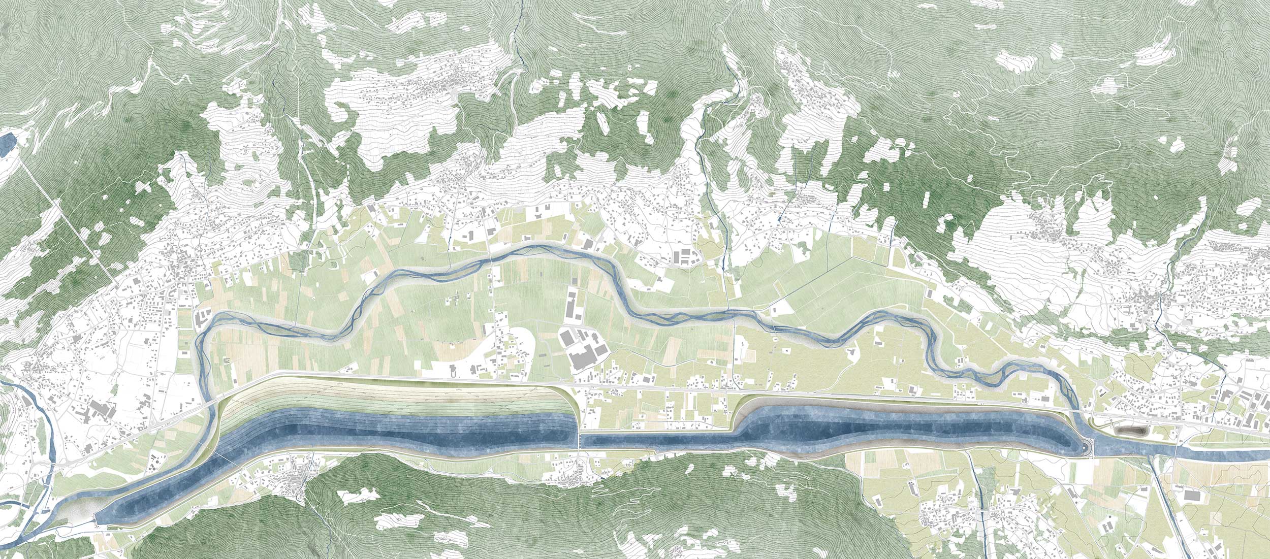 Die vorgeschlagene Intervention liegt zwischen Sondrio und dem Comersee. Die Adda fliesst hier stark begradigt am südlichen Rand einer breiten Talsohle von Ost nach West. Zuletzt wurde ihr natürlicher Verlauf in den 1980er Jahren durch das Errichten von Dämmen eingeschränkt. Der alte Flusslauf, die Adda Vecchia, ist immer noch gut erkennbar, wird aber heute nur noch als Entwässerungskanal für die angrenzenden Landwirtschaftsflächen genutzt. Die parallele Existenz von neuem und altem Flusslauf, sowie das Vorhandensein der bestehenden Dämme birgt Potenzial für einen Projekteingriff.