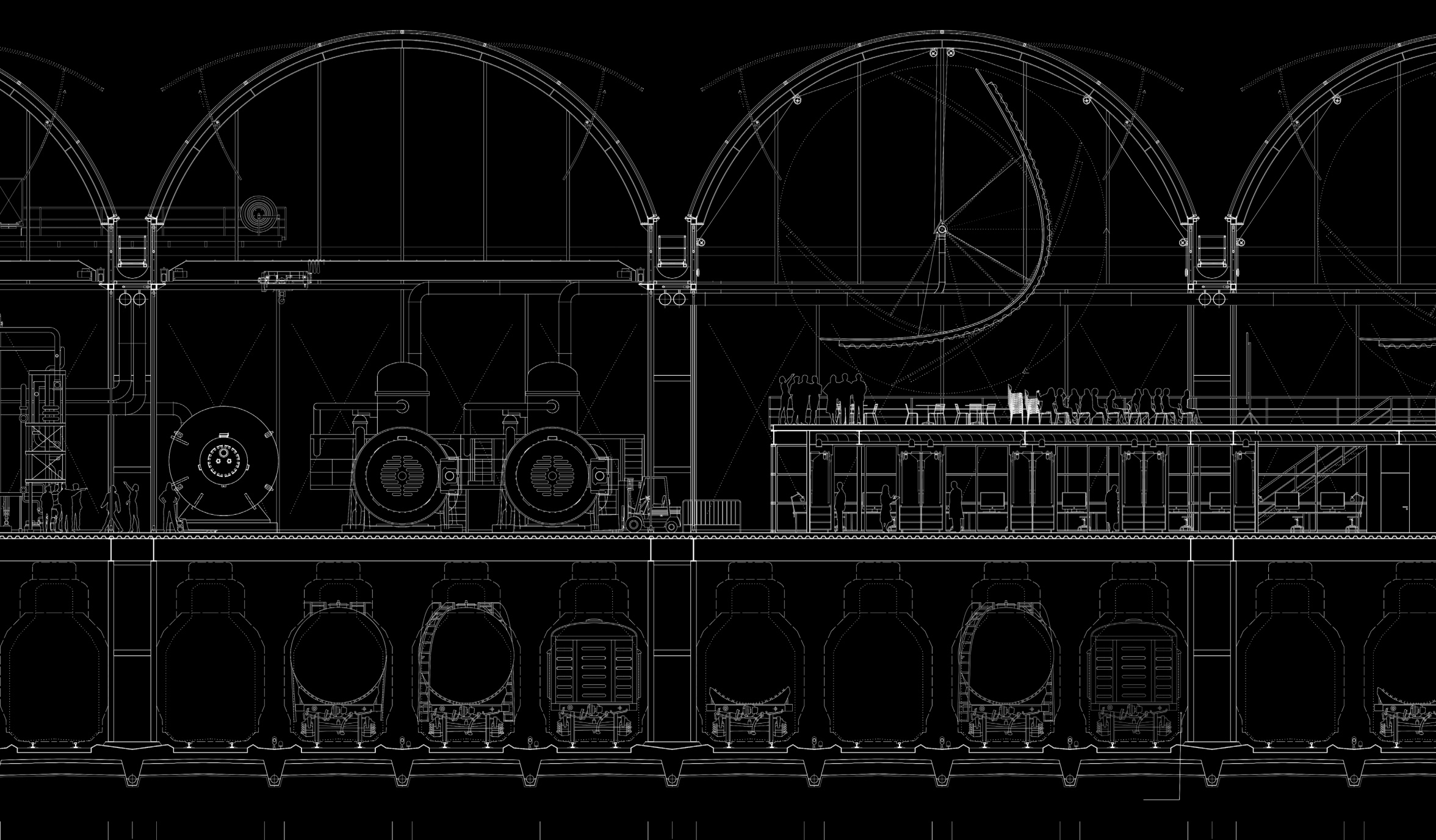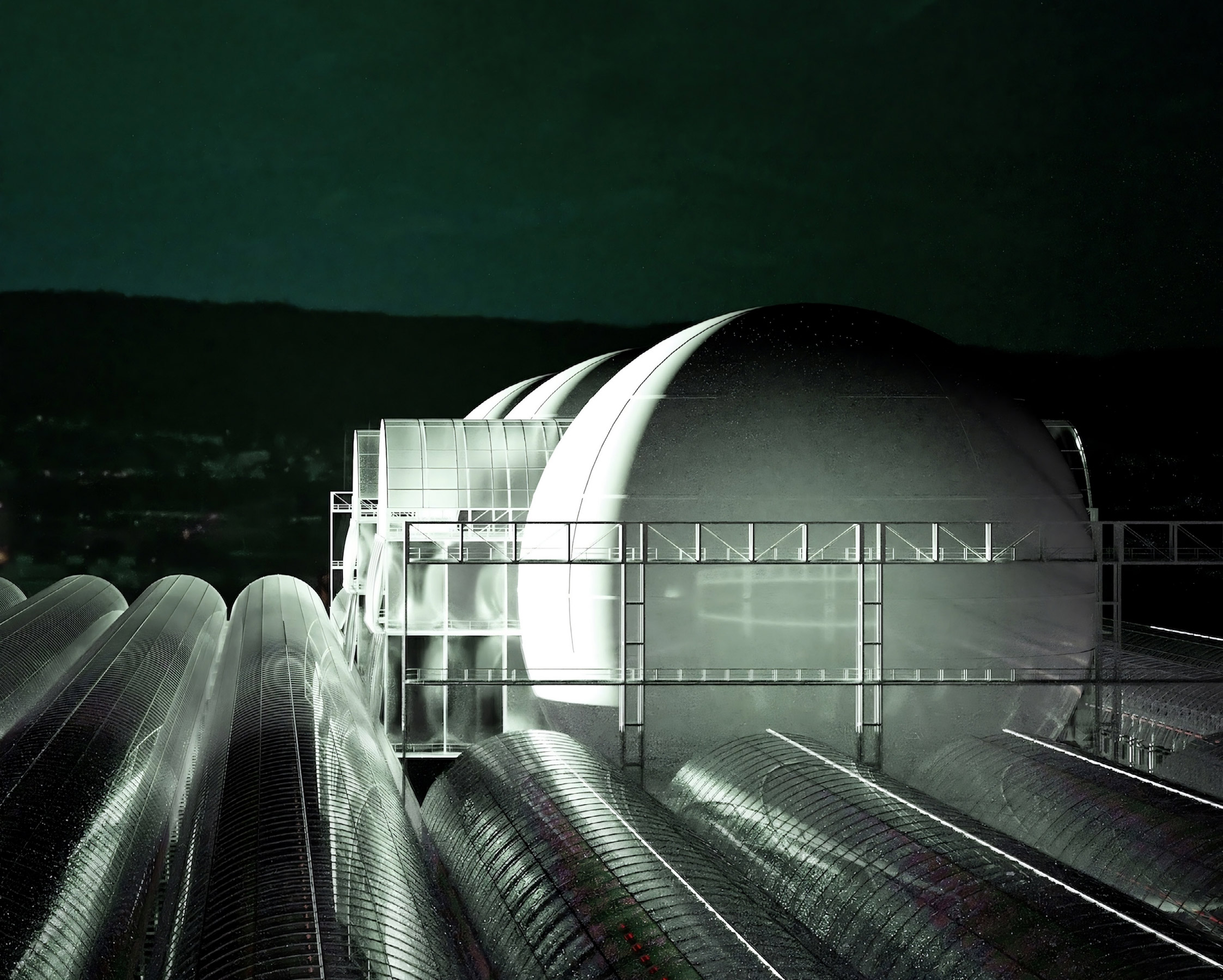 The rapidly growing settlement area in the Limmat Valley is increasingly coming into conflict with existing infrastructure, logistics and agriculture areas. Hybrid programmes can be used to generate higher density and synergies. The large area of Spreitenbach’s SBB marshalling yard is an area of considerable potential to introduce renewable energy on an existing infrastructure and to supplement it with further programmes. The marshalling yard will be expanded to include a solar and biogas power plant. Parabolic mirrors concentrate the direct solar radiation on a single point, generating process heat for the nearby industry and supporting its decarbonisation. The exposed location of the railway station allows algae to be cultivated in photobioreactors, which quickly produce large quantities of biomass. This biomass can be converted into biogas and then into electricity and process heat. Parts of the site can be transformed into a landscape park, characterised by microclimate-specific vegetation.