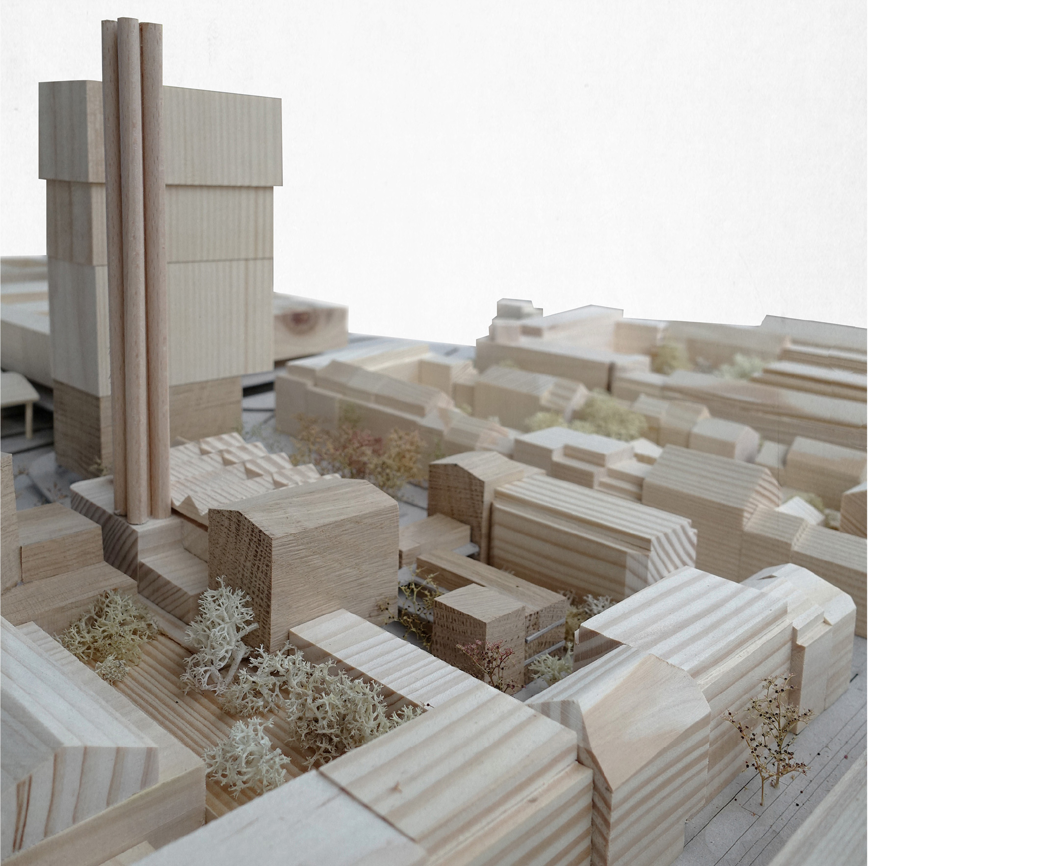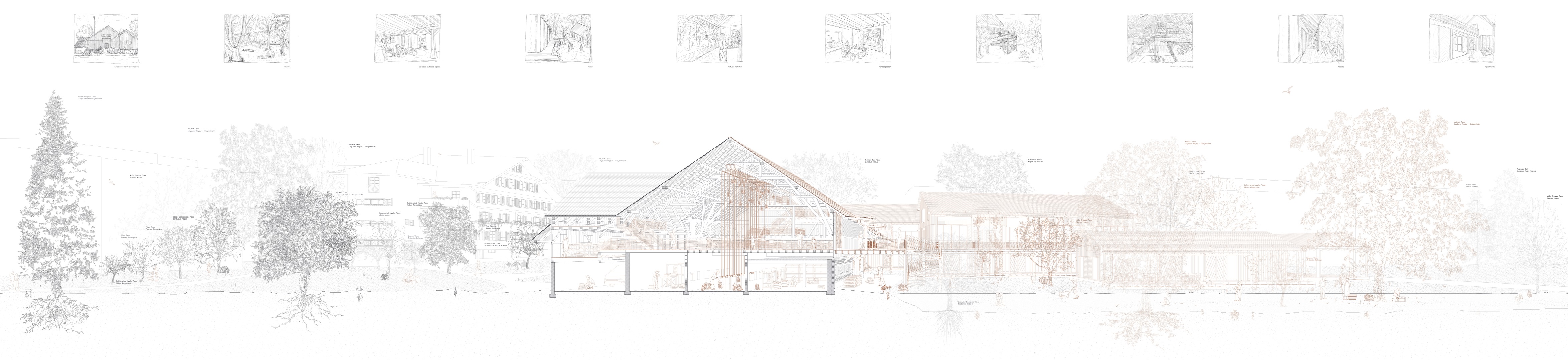 Das Projekt «Stoa» wächst in den Innenhof. Dieser Abschluss der Blockrandbebauung ist eine poröse Raumstruktur und bildet gleichwohl eine Platzfassade. Das Ensemble aus drei suffizienten Gebäuden und dem Verknüpfungsbau schafft positive Abhängigkeiten. Im Sinne des zirkulären Bauens werden Bauteile aus dem lokalen Umfeld wiederverwendet. Die nachhaltige Ausschöpfung von Bauteilen wird durch eine Neuinterpretation zu einem neuen Ganzen geformt.