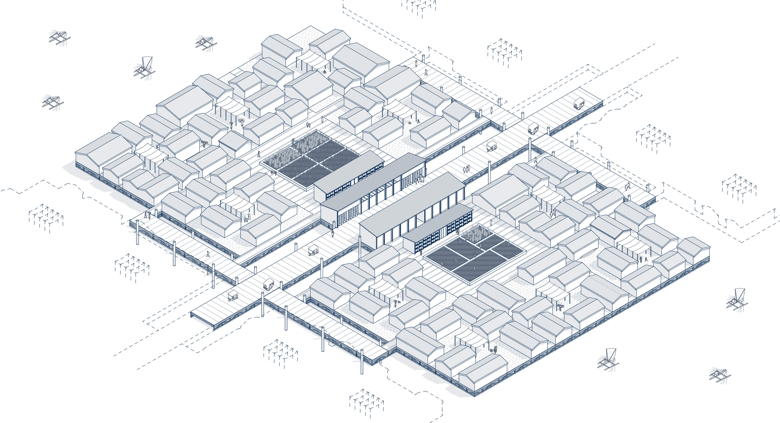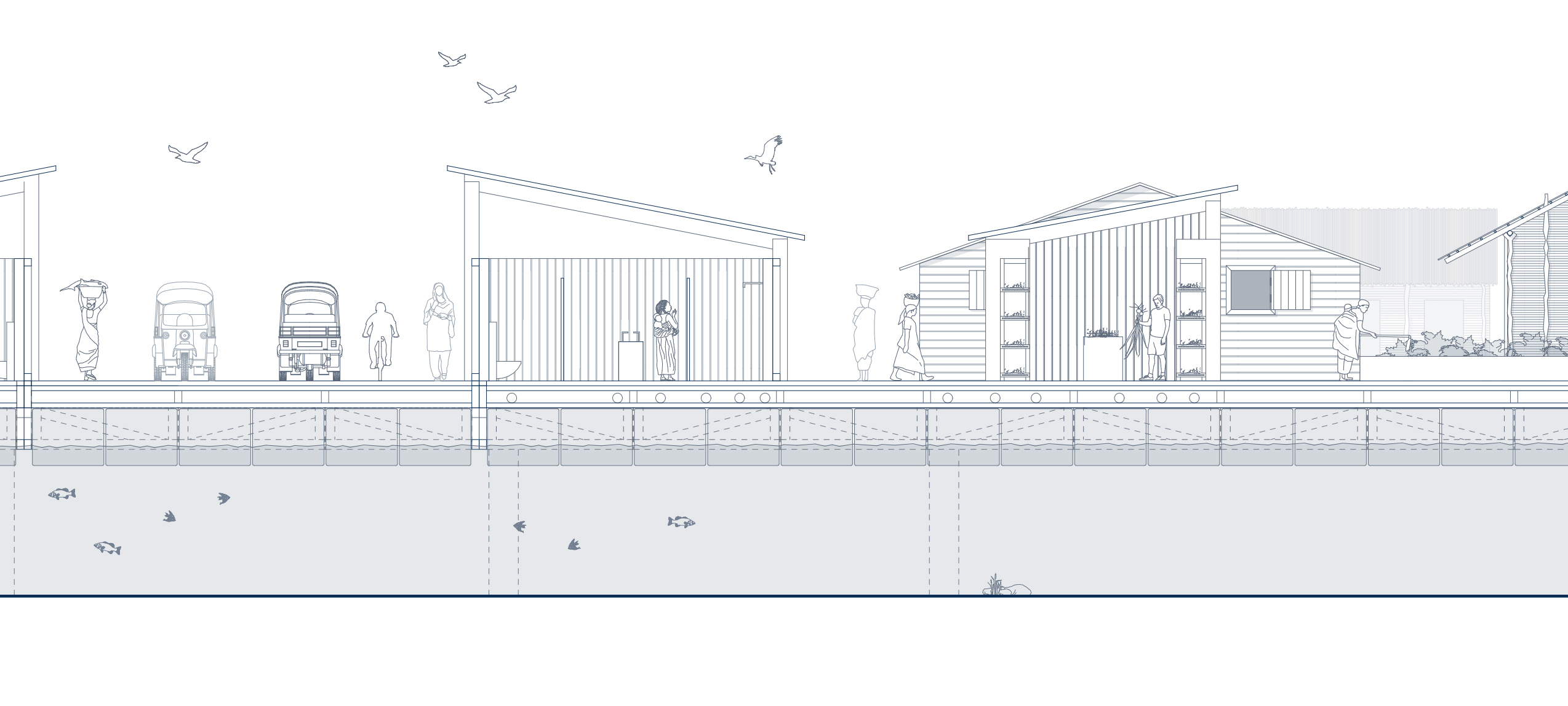 Les membres de la communauté Vezo ont vécu de la pêche durant des siècles le long des côtes de l’île de Madagascar. Aujourd’hui, la montée des eaux, les changements climatiques et la chute de la biodiversité menacent leurs modes de vie, leurs habitats et les sources de leur subsistance. Le projet cherche des solutions innovantes permettant aux plus démunis d’imaginer un avenir viable. Il propose une infrastructure constituée d’une trame de pontons flottants raccordant le nouveau quartier au réseau urbain et à tous les flux (transport, électricité, eau, ...). Cette structure accueille des plateformes et s’agrandit au gré des besoins. Des maisons en auto-construction peuvent y prendre place reproduisant l’implantation autour de cours familiales traditionnelles. Chaque plateforme offre un espace commun de jardinage, des équipements sanitaires, des espaces de rencontre et des locaux commerciaux mais également des lieux de compostage des déchets organiques ou des citernes. A l’échelle du quartier, on trouve des équipements collectifs. Abrité par la digue du port existant, et occupant la surface dépourvue d’eau à marée basse, le nouveau quartier complète l’infrastructure existante et se rattache à la ville par une digue (déjà projetée par les autorités) accueillant des équipements collectifs et créant la transition entre la rue de transit publique et les ruelles domestiques du nouveau quartier. Ce système, tel un kit de construction pourrait s’implanter à d’autres endroits le long des côtes de l’île pour permettre de vivre en préservant mode de vie de pécheurs et en s’adaptant aux lieux existants et aux nouvelles conditions climatiques.